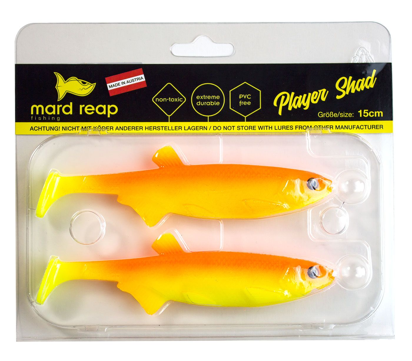 Besondere Merkmale sind ein Schlitz im Bauch für Offset-Haken und Finesse-Techniken, ein Hakenkanal für einfache Montage auf Jig-Haken sowie eine Lagerverpackung im Blister mit einer speziellen Aussparung für den Jig-Haken. Hergestellt aus TPE, kann der Mard Reap Player Shad sicher mit allen anderen Mard Reap Produkten gelagert werden. Es ist jedoch wichtig, ihn niemals direkt mit Gummiködern anderer Hersteller in Kontakt zu bringen, die aus Plastisol PVC bestehen!
